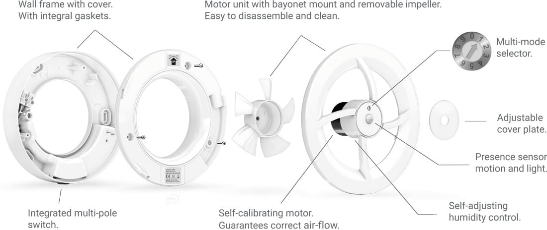A SmartFan X9 egy kiváló minőségű fürdőszobai ventilátor, amely kielégíti a magas funkcionális és tervezési elvárásokat. Kínál kilenc különböző üzemmódot, amelyek lehetővé teszik a szellőztetési igények széles skálájának kielégítését, beleértve az automatikus páratartalom-szabályozást és az időzítővel vezérelt műveleteket. Emellett beépített infravörös mozgásérzékelővel is rendelkezik.